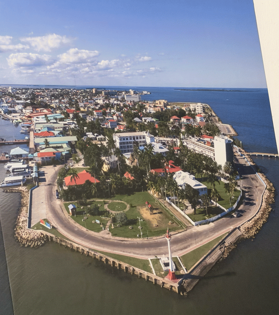 This is a photo of an aerial view poster of the section of Belize City where we stayed. The tower of the Fort George Hotel is on the right, The lighthouse in the middle and the Belize sign along the shore on the left. Just past the water taxis, on the shoreline with the red roof, is Martha’s Cafe which is featured later in this post.