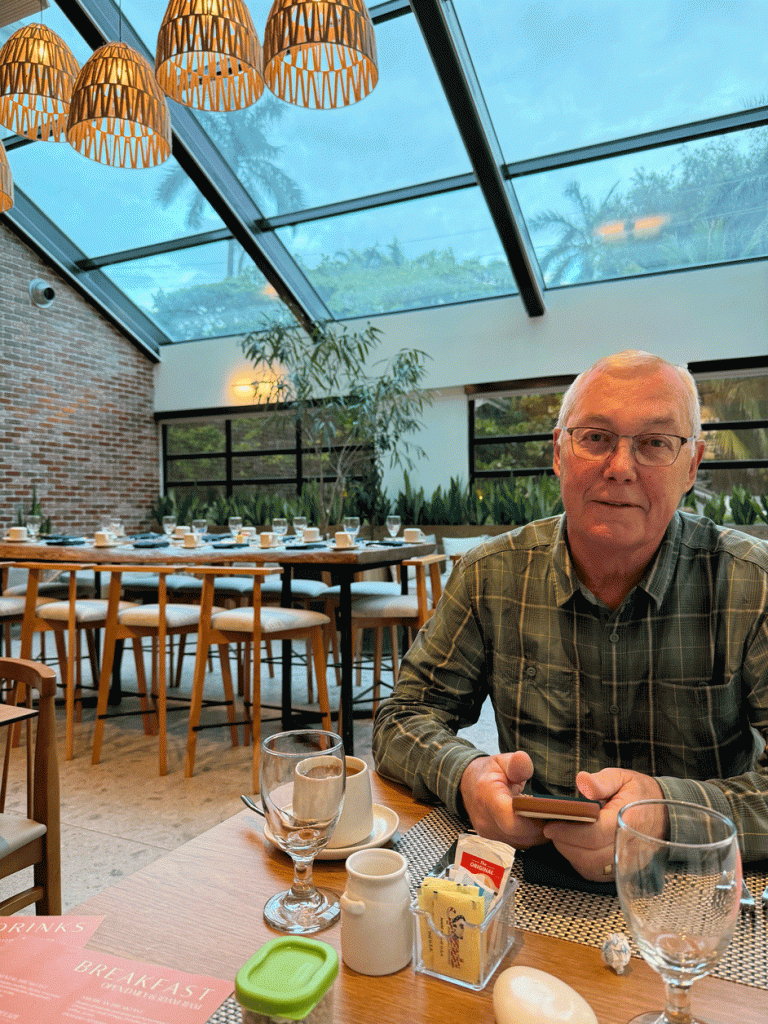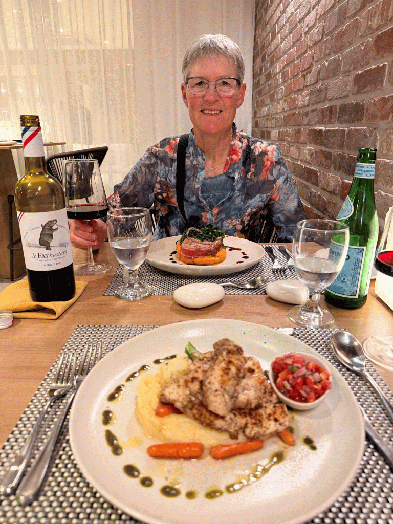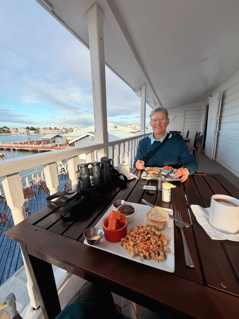 We had one “special” dinner to celebrate our 50th (again!) on our first day in Belize at the fancy restaurant at the Fort George Hotel. Doug enjoyed a snapper fillet with truffle mashed potatoes and Wendy had pepper crusted Ahi tuna. For breakfast, we ate in the glass ceilinged section of the same restaurant (The Tree House.)