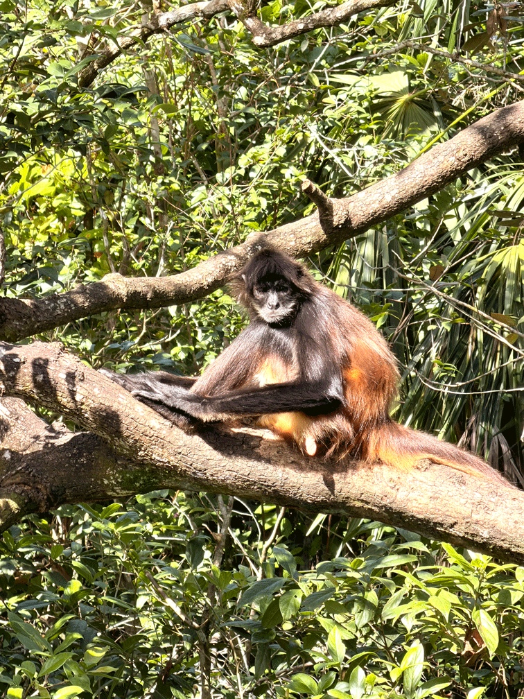 Here’s a spider monkey. We saw many of this species throughout our trip, but these were the closest. Spider monkeys move through the forest by swinging, while howler monkeys climb.
