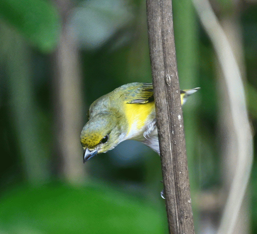 This is a female Yellow-throated Euphonia, a tiny tropical finch. There was a male nearby, and our guide was surprised that they were the same species, because the male’s plumage is so bold with a dark blue top and bright yellow underside.