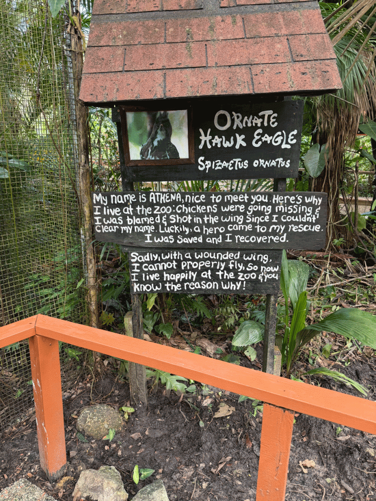 The signs are quirky and most of them explain why the animal is at the zoo, while others focus on how important it is to protect wildlife. All the animals in the zoo have been rescued, orphaned, injured or abandoned and are native to Belize.