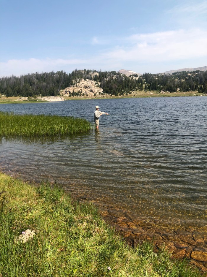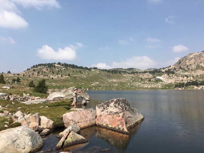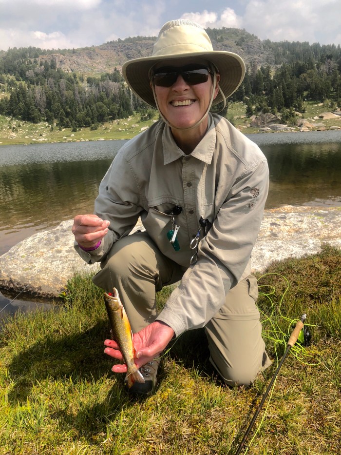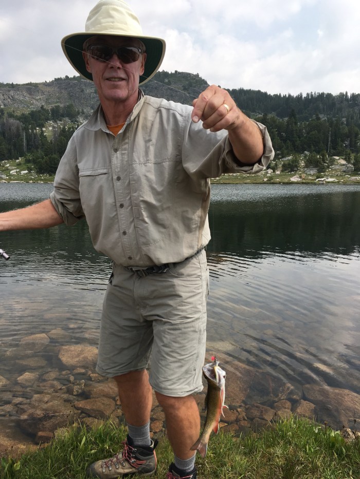 Back to fishing: this time after buying some recommended flies and a hiking guidebook that described the route to Upper and Lower Sheepherder Lakes. The first photo is the “follow your nose” route to Upper Sheepherder and the next two are at the lake. It was a beautiful lake, but with no fish action, so we headed back down to the lower lake. Doug caught a fish on one of his first casts and enjoyed catching and releasing several. Wendy was happy to catch and release a little brook trout, especially because she had improved her cast enough to get her fly out to where the fish were feeding.