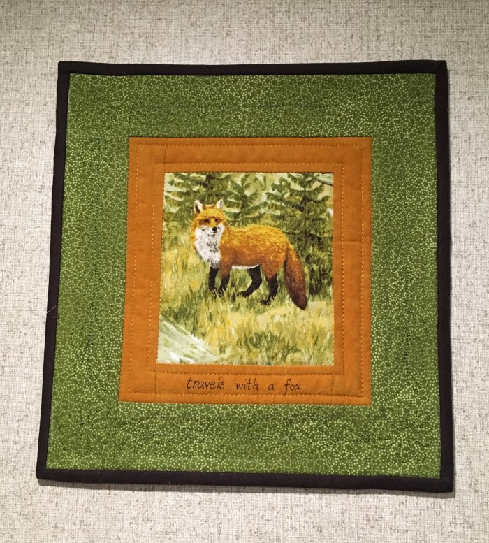 Our “travelswithafox” mascot has gone through another change. We hung the new wall-hanging in the trailer above Wendy’s chair; which you can see in the photos below.