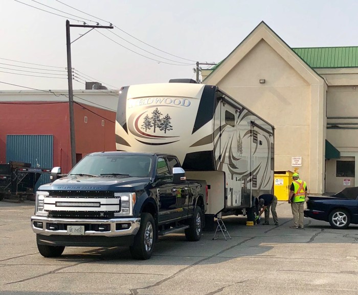 Our original plan for August was to go off in our camper into the bush close to home, but the smoke from wildfires made us change our mind. We stayed in Cranbrook until Wendy took her “house trailer endorsement” road test. Here’s a photo of her doing the pre-trip inspection during her test. The road test went well, even through the mid-day summer traffic and she is now certified Class 5 with 07 endorsement. We left town immediately after the test for Montana, where we hoped we would be out off the smoke.
