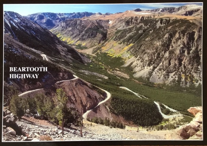 We stayed an hour east of Missoula, at Bearmouth for the first night. The next day we drove through to Red Lodge, Montana and stayed at the KOA. We chose Red Lodge because of its proximity to the Beartooth Highway, a engineering marvel. The road goes up to Beartooth Pass at over 10,000 feet. Here’s a photo of a postcard showing some of the switchbacks.