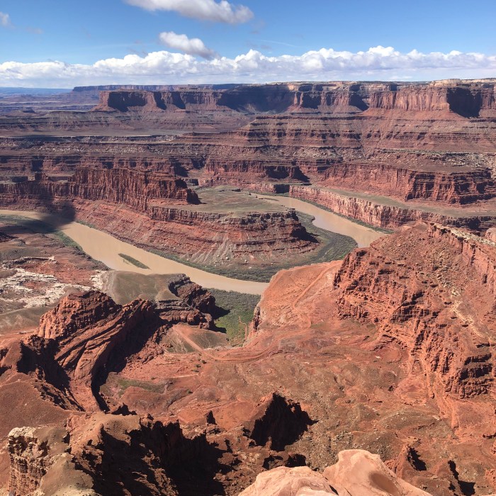 The weather improved for our last day in Moab. We drove up to Dead Horse State Park and Canyonlands National Park: Islands in the Sky Unit and stopped at most of the overlooks. Here’s a view from Dead Horse State Park down to the Colorado River.