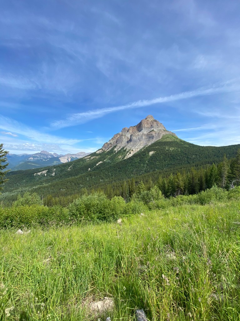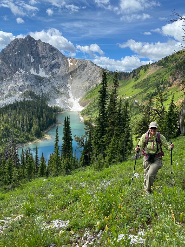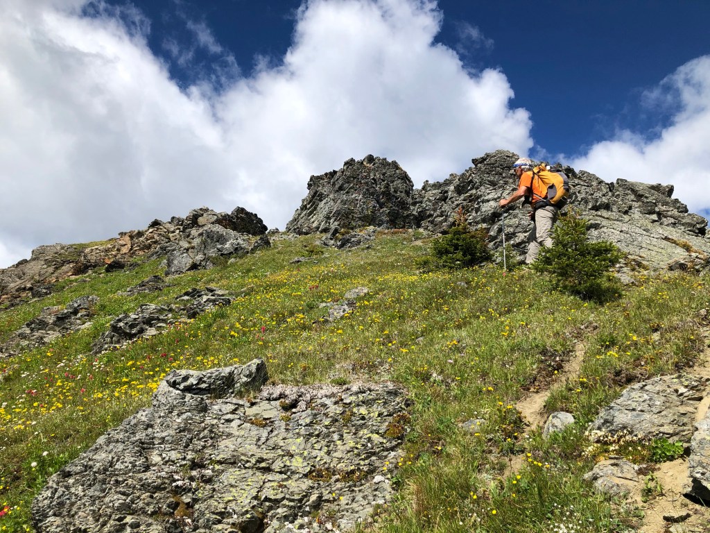 We reached the highest point on the ridge close to noon. From there, we had a great view of Bear Lake, and could even see Cranbrook, although it’s not visible in the photo below. We had an enjoyable lunch, without much wind, with the bonus of cellular coverage so we could send photos to family and friends.