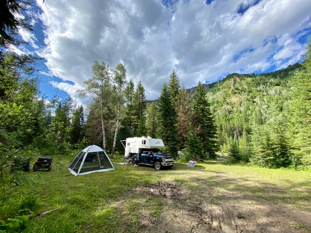 Here’s a photo of our camp fully set up: bug tent beside the camper, portable solar panel connected, outside cooking area, and shower tent (out of view.) We also brought our quads along.