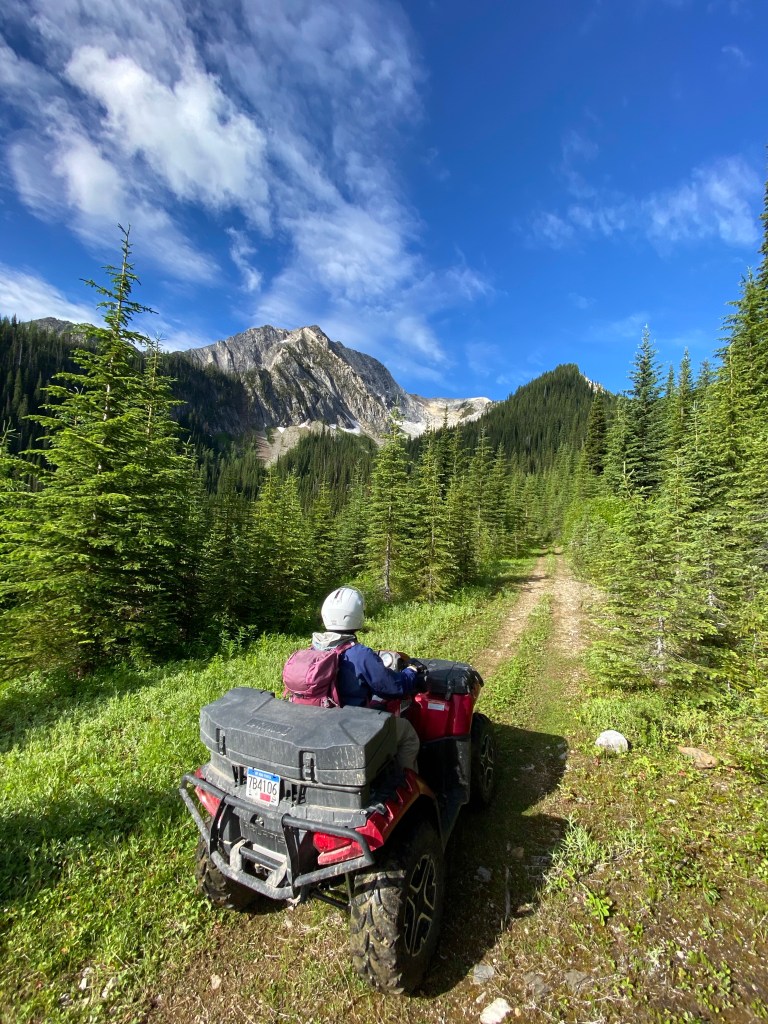 The next day, we used our quads to access a hiking trail we knew. We drove up the Forest Service Road, past Summer Lake and on to an old road. When we first discovered this road thirty-six years ago, we could drive up the four kilometres in our full-size pickup. Now most of the road is thick with alders, but there were a few views along the way.