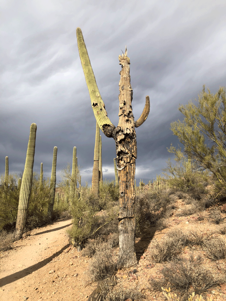 Saguaros can still live when parts have been destroyed. This one is awarded with: “Beat up but Still Alive.”