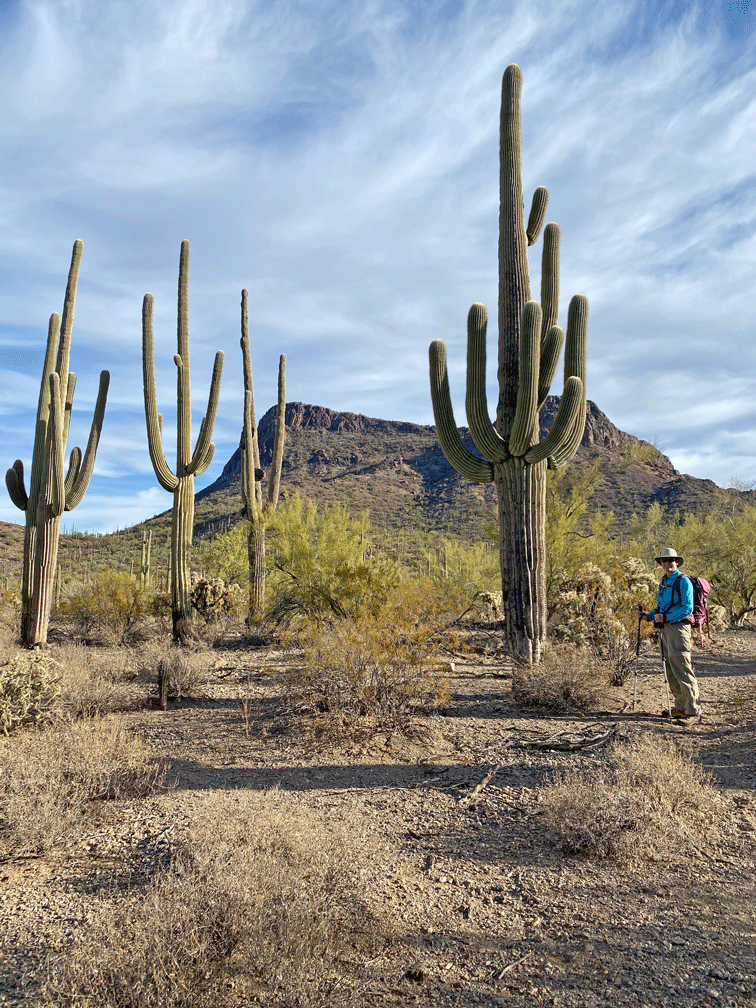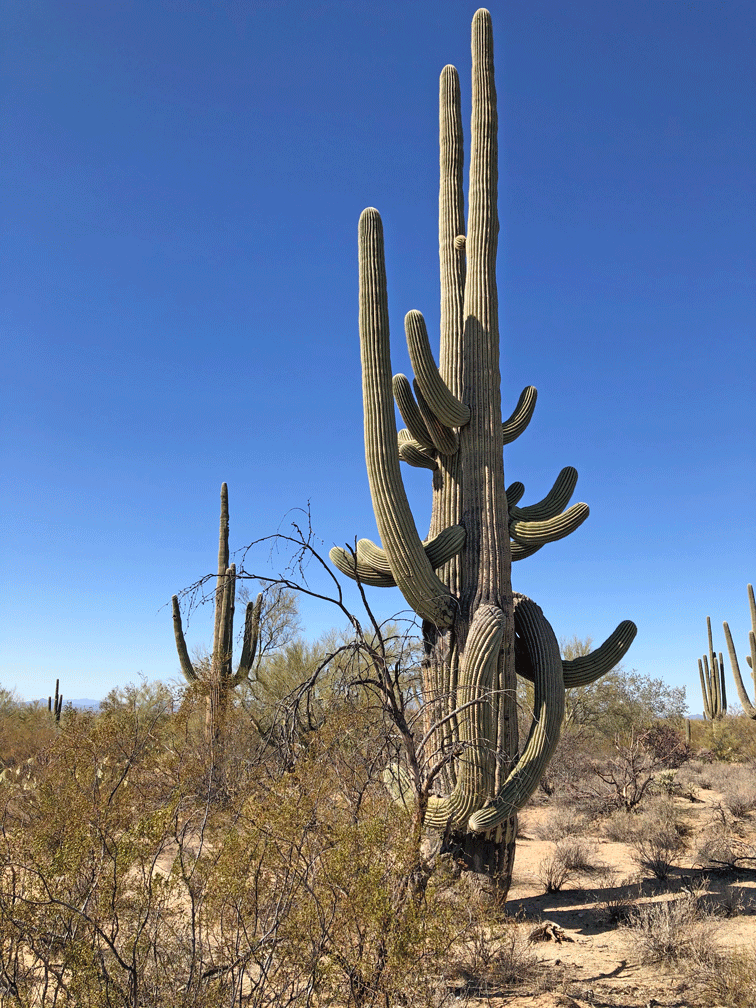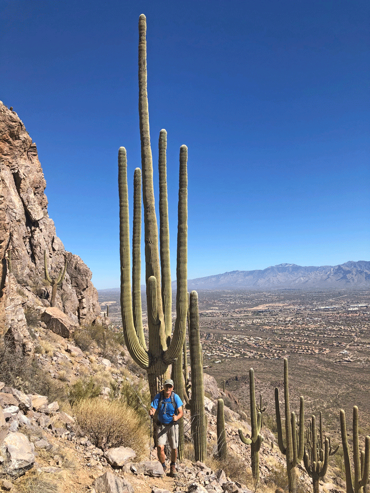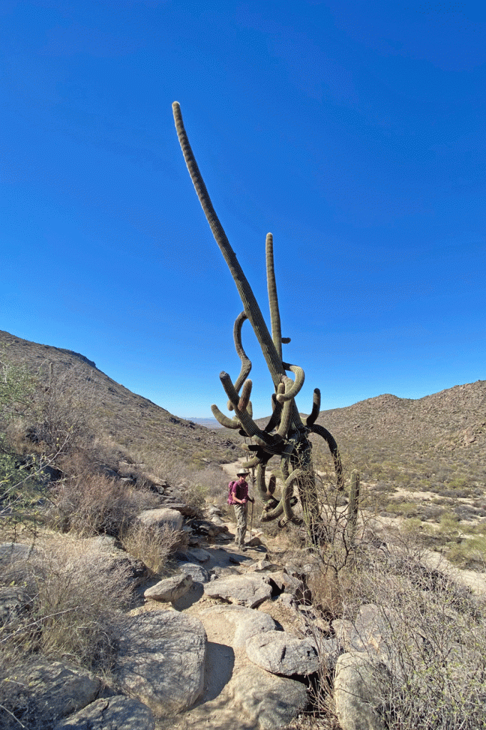 This one is one of the tallest we have seen. Also, it is on the trail to Sombrero Peak, so it wins: “Tallest Saguaro at Elevation.” A saguaro rarely reaches 15 metres in height and occasionally 12 metres. More commonly they are 10 metres tall. If Doug is used as a scale, (he is about 2 metres tall), this one seems to be 14 or 15 metres tall.