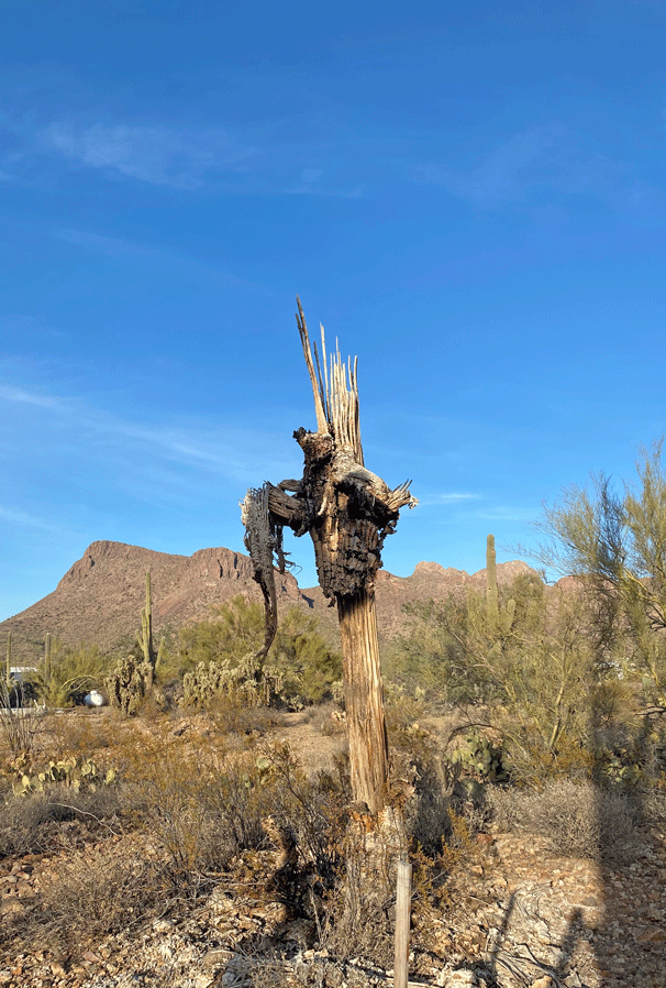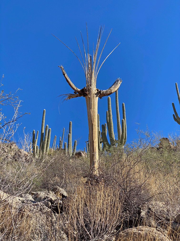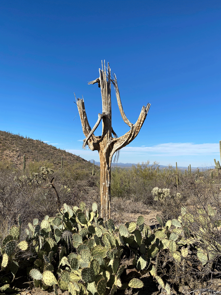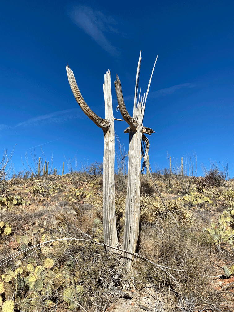 We saw these two saguaro skeletons on a ridge in the Tortolita Mountains. Their award is: “Together in Life and Death.”