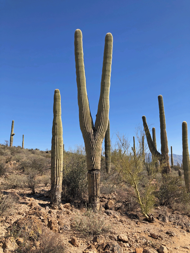 Most saguaros have one main stem with arms that branch out. Sometimes something causes two leaders to develop. This is the only one that we’ve seen with three. Its name is “Triple Top.”