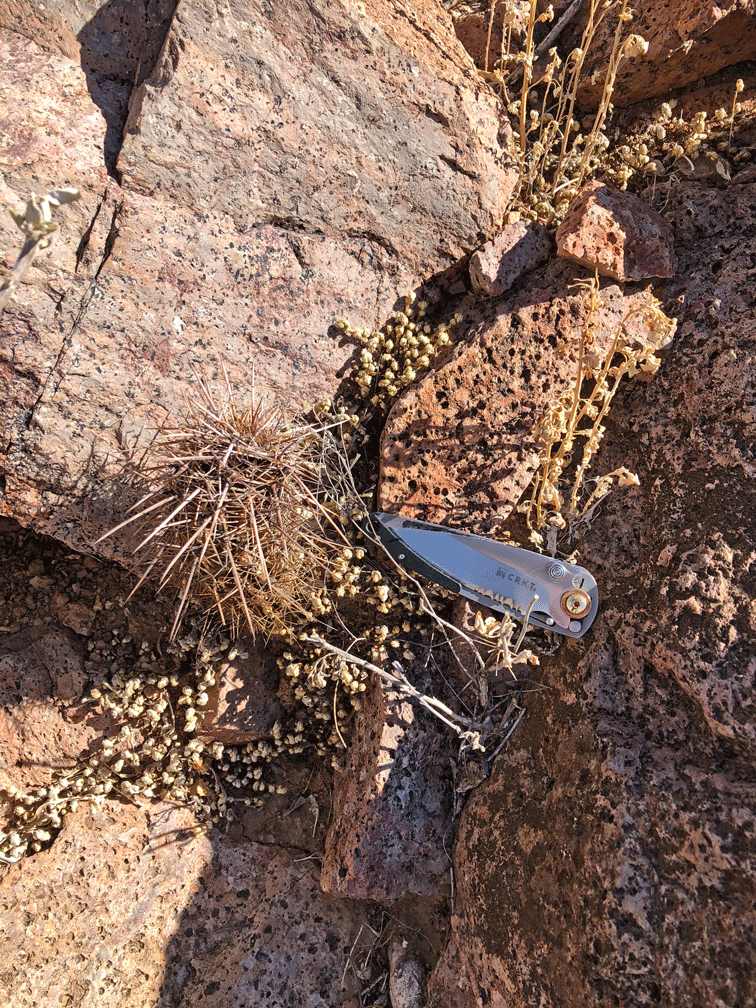 Saguaros grow from a seed and they struggle for their first years. The knife is in the photo below is about 10 cm long, so this little one isn’t much bigger than that. A 15 cm saguaro is estimated to be 9 years old, but growth is dependent on the amount of water it receives. This little one was growing alongside the rough trail to Panther Peak. It wins: “Smallest Saguaro on the Trail.”