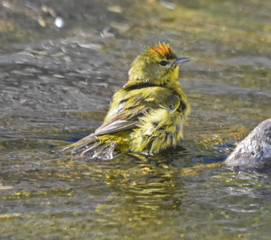 This little bird was enjoying a bath in the stream at the entrance to the wetlands. Its the most unusual sighting of an Orange-crowned Warbler that we’ve had.