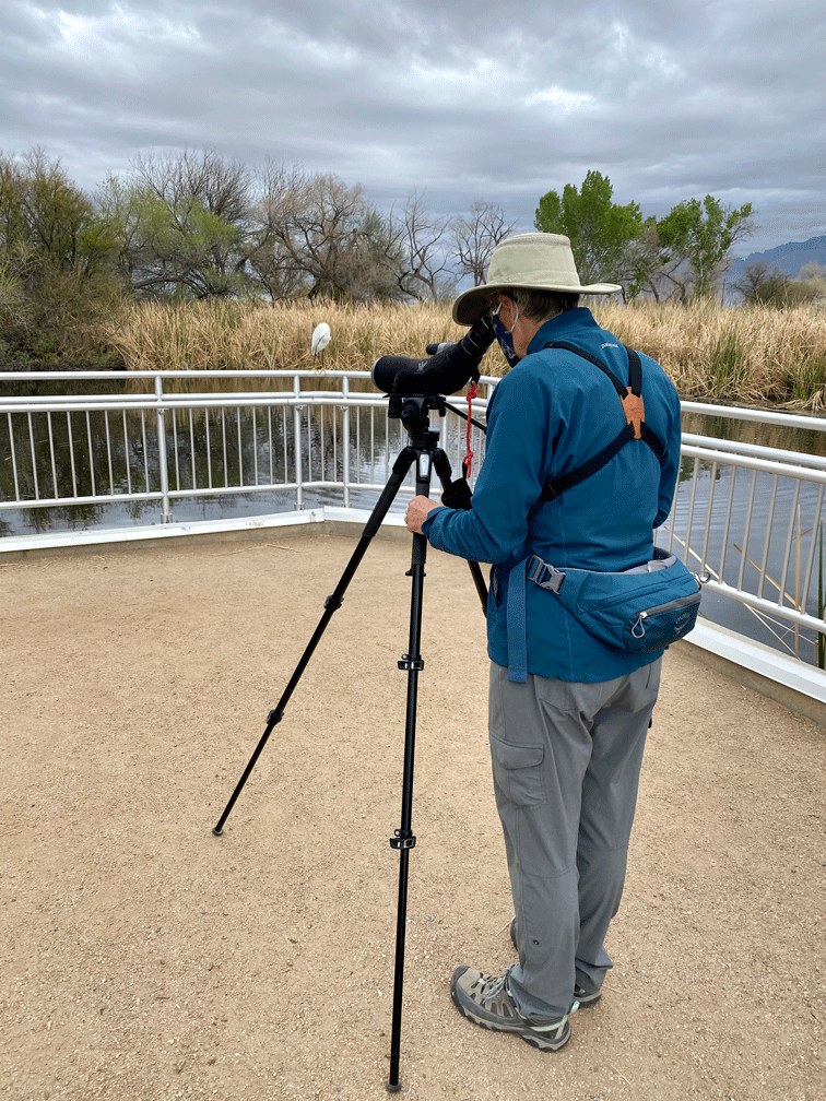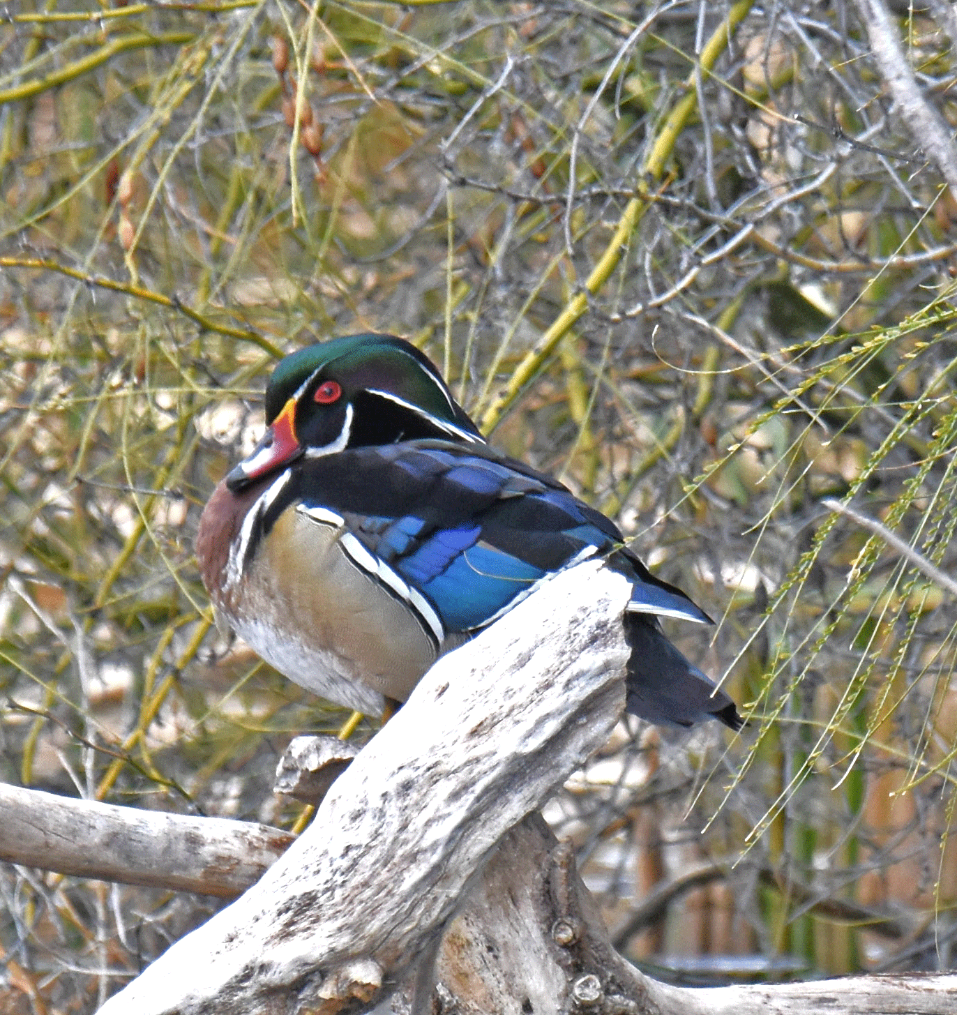 One last location to describe. We went to Sweetwater Wetlands several times in February. On this particular cooler, cloudy day, the Snowy Egret was putting on a good show and seemed quite comfortable standing on the railing. We took plenty of pictures of it, but still wanted to see the other birds in the pond. You can see Wendy looking through the ‘scope and with the unperturbed Snowy Egret on the railing. We were rewarded with a good view of this male Wood Duck.