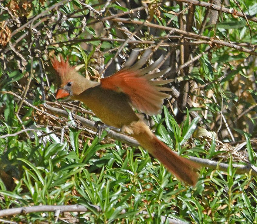 We often see a Northern Cardinal when we go birding, especially in the Tubac area. Doug had fun catching this female cardinal in flight.