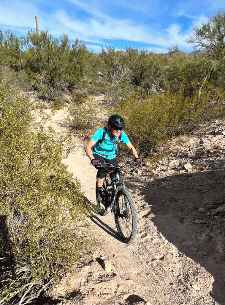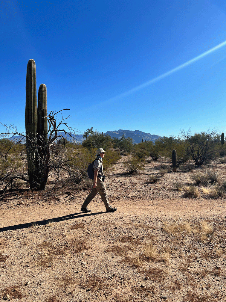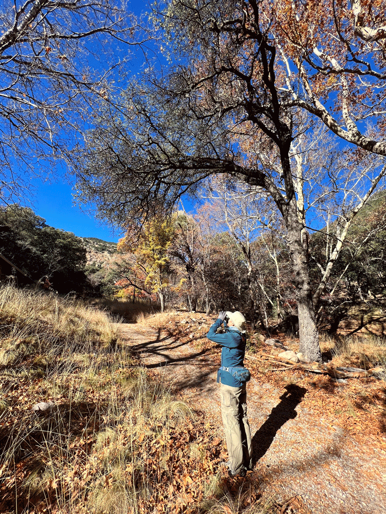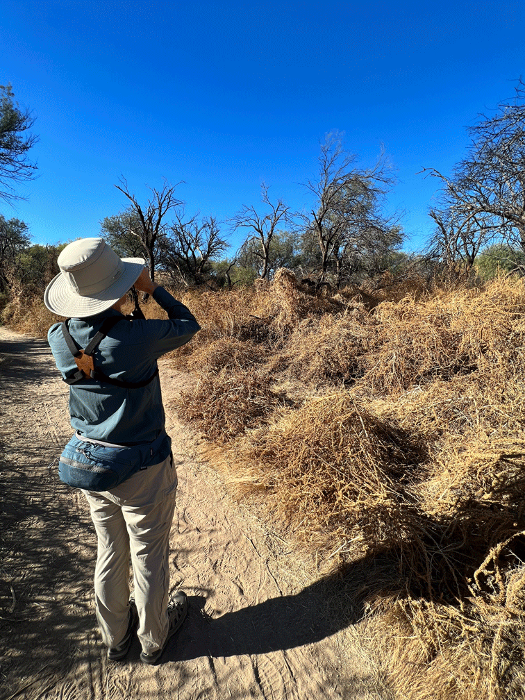 There are also some birds that are in a known location that almost every birder wants to see, but they are still hard to find. We visited Catalina State Park with the intention of seeing some Long-eared Owls. Luckily, a kind birder saw us coming down the trail and walked back with us to the spot where he had seen an owl. He told us someone had showed him the spot, so he was passing it on. We have to thank the first birder who found their day’s roosting spot and let someone else know. Here Wendy is looking at a “lump” in the far mesquite which is actually a Long-eared Owl.
