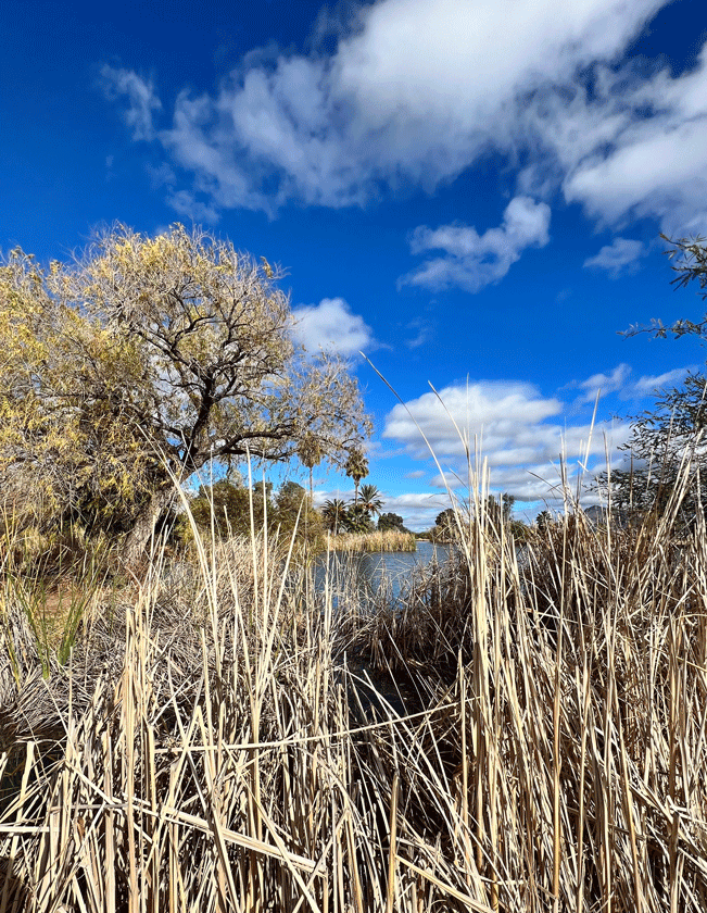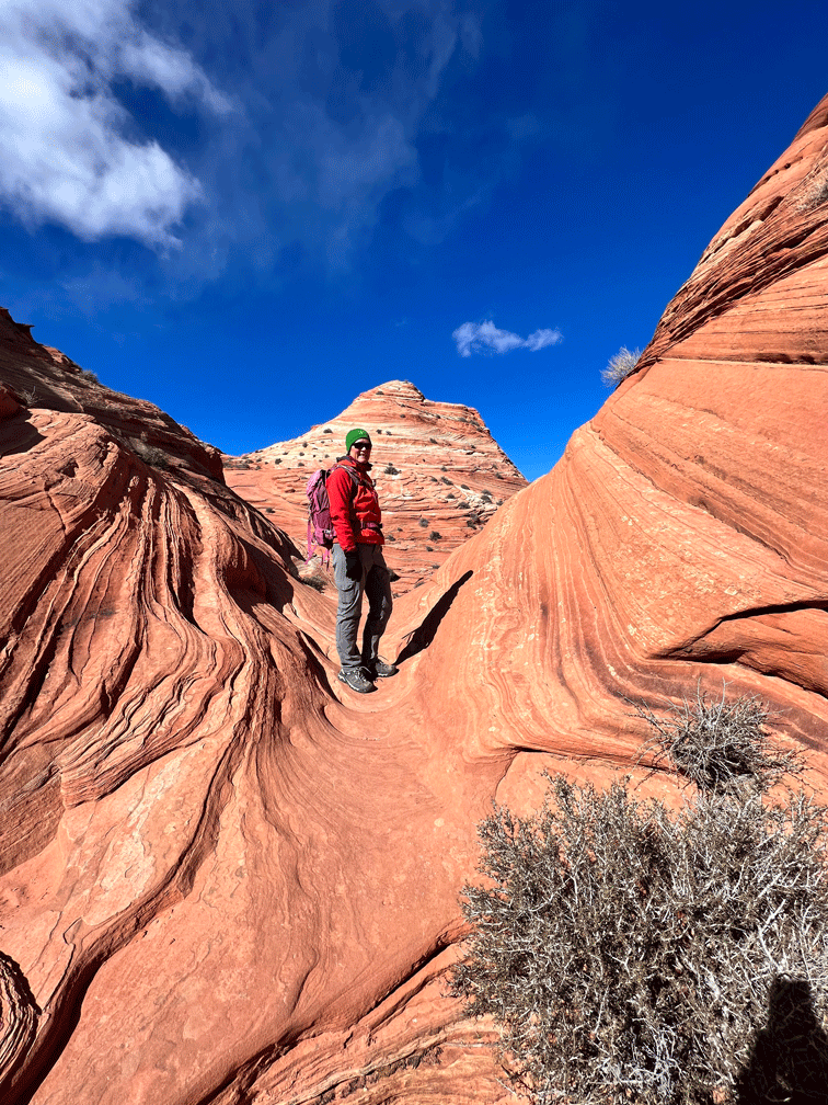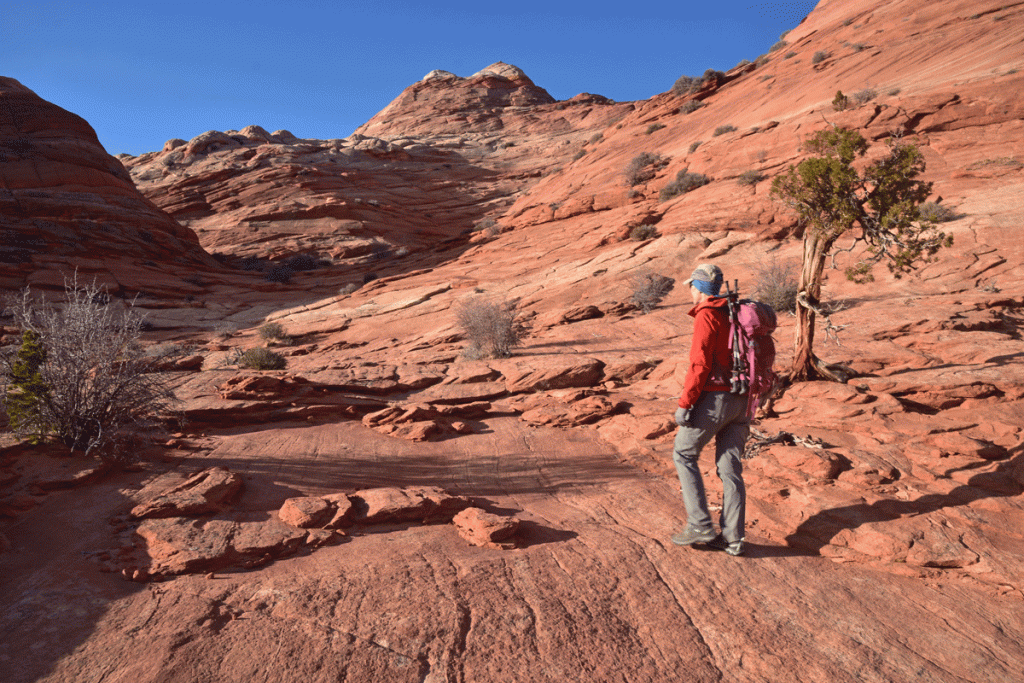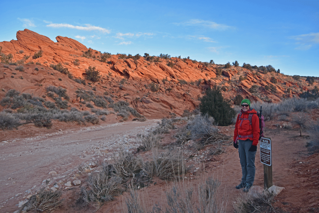 February 2 was clear and cold (-6 degrees C) for the start of our ten kilometre (6 mile) round trip hike. The route has the same start as the Wire Pass trail that we have hiked a number of times. Here’s the spot that it leaves the wash.