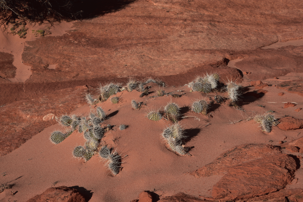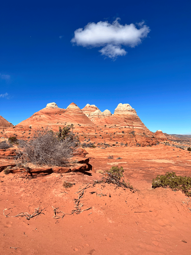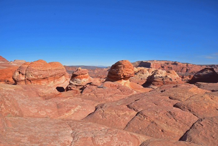 Within a half an hour, we were down, through the sand dunes and up again on the slick rock. Here’s a view of “The Teepees,” some interesting rock formations that we could see from the route.