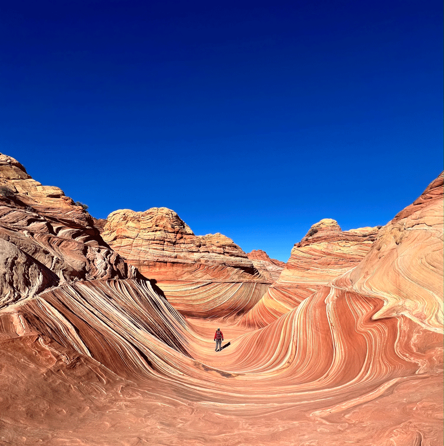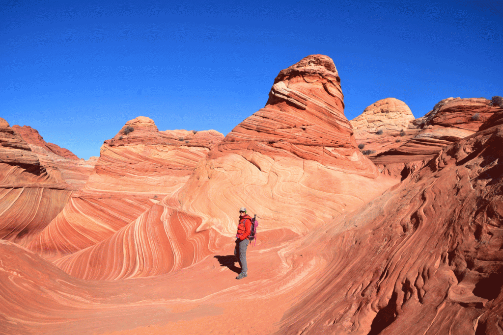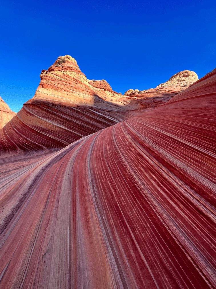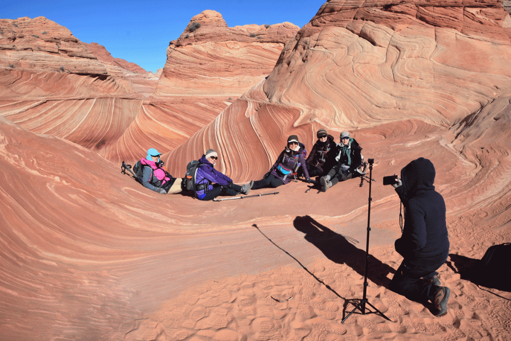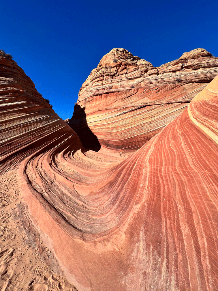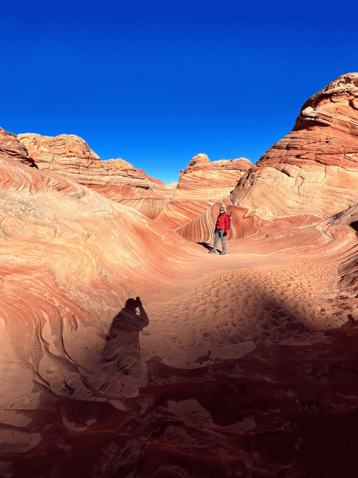 The Wave is a premier photographic destination in the US southwest. It is so popular that is requires a permit issued by lottery, limiting the number of visitors that are allowed per day. We obtained ours on-line from the US Bureau of Land Management after being unsuccessful over a dozen times. So we were really happy to get a chance to go. Although “The Wave” is in northern Arizona, it is accessed through Utah. It is only one of many interesting rock features in the North Coyote Buttes, but it is the most famous.