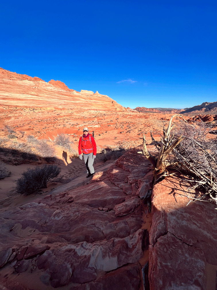 About a half hour from the trailhead we finally found a place to have lunch that was not too windy. We made it back to the truck around 2:00. It had only warmed up to 2 degrees C! Hot showers in our hotel in Page were next on our list.