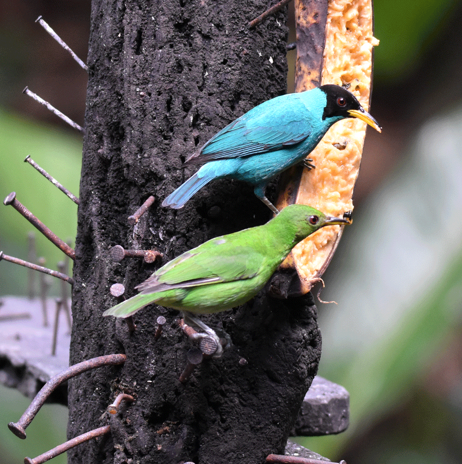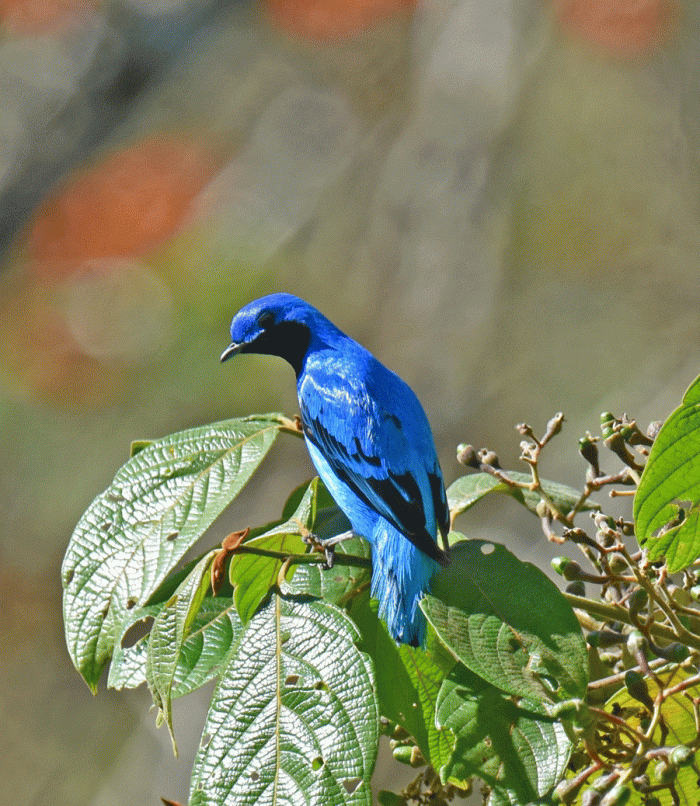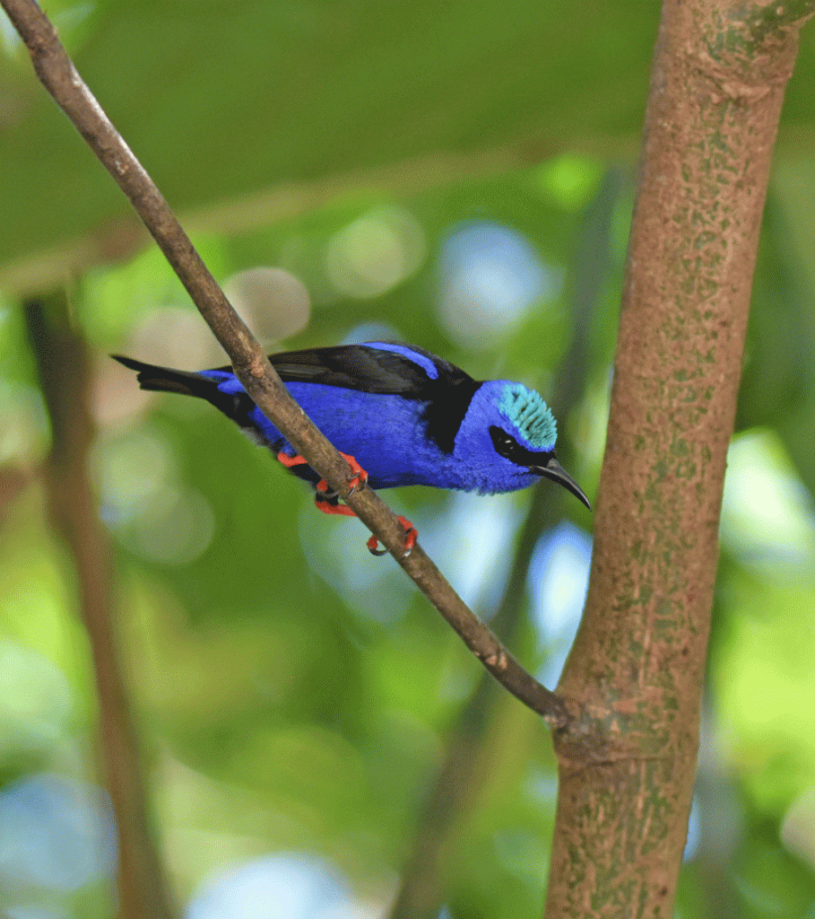 After breakfast the next day, we stopped at a spot on the road that overlooked a ravine. We were almost even with the upper branches of a tall fruit-bearing tree. We waited for about half an hour before a cotinga arrived. This beautiful blue-coloured cotinga is called a Lovely Cotinga, and was a new bird for us. It’s a rather chunky bird, that is just a little shorter than an American Robin.
