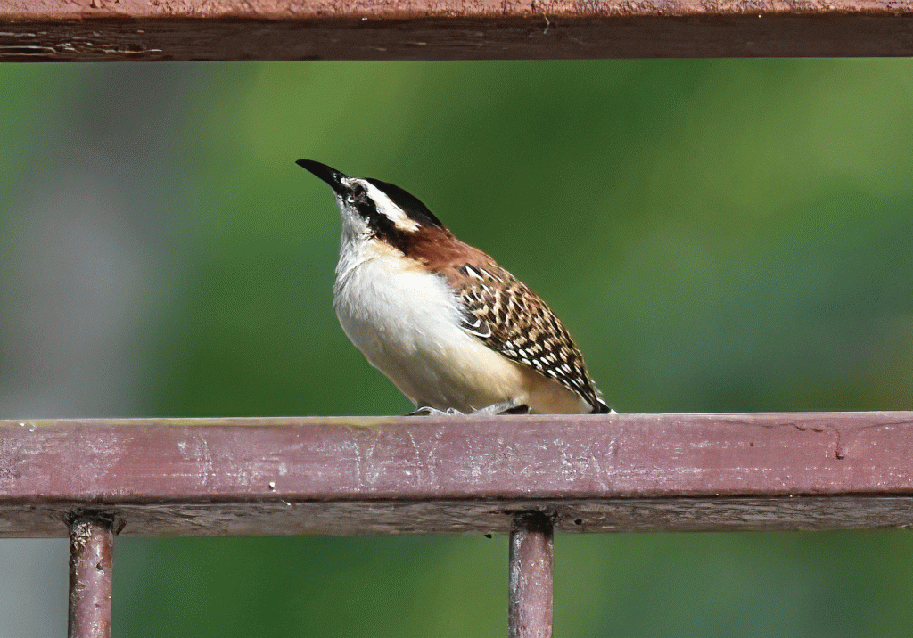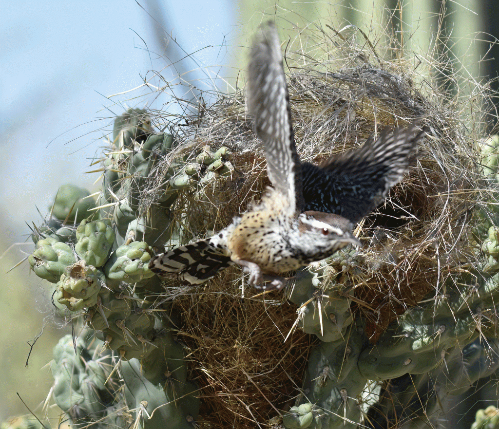 Every time we visit the cactus garden at the Desert Museum, we check out the Cactus Wren nest. We saw the wrens building this nest earlier this year and now they are feeding chicks. Here’s a shot of a Canyon Wren exiting the nest.
