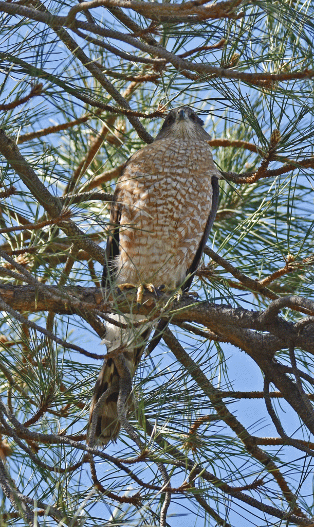 Here’s a close-up photo of the same bird. This Cooper’s Hawk was calling frequently from the same perch, so we were able to locate it easily.