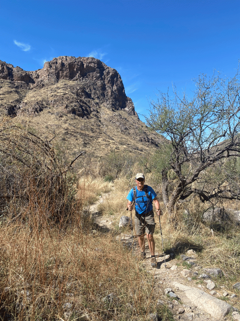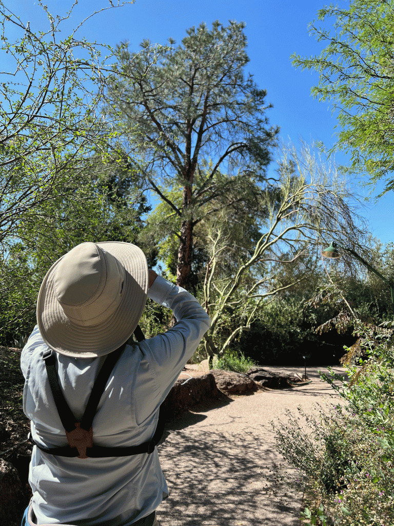 We visited the Arizona-Sonora Desert Museum a couple of times. Wendy is looking at a Cooper’s Hawk sitting on the highest horizontal branch on the right.
