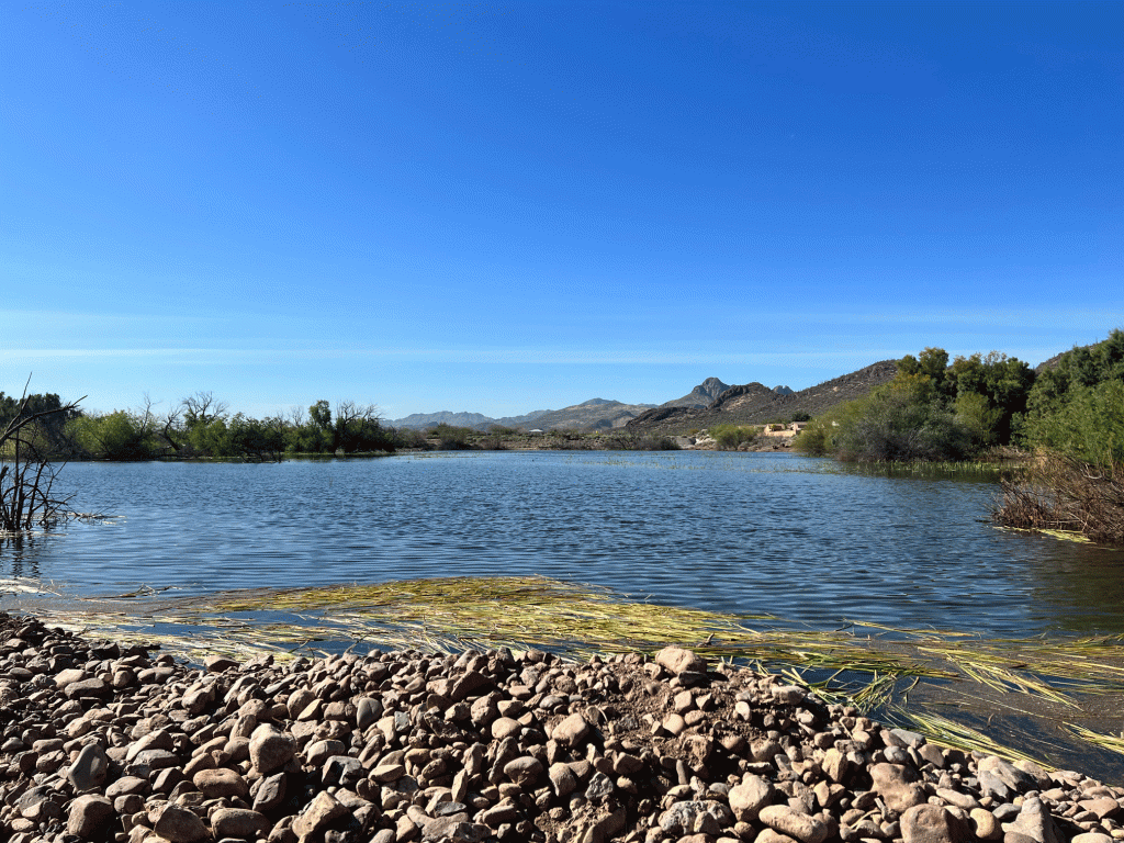The pond at El Rio Open Space Preserve had been dry for an number of months. Marana Parks had done some rehabilitation work, removing overgrown trees along the shore and cattails that were encroaching the pond. Here’s a view looking south of the banks that were built up at the far end, taken about a week after they started filling the pond.