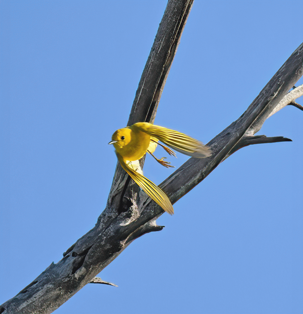 This Yellow Warbler was singing high in the branches of a dead tree. Just as Doug focused and took its picture, it took off in flight.