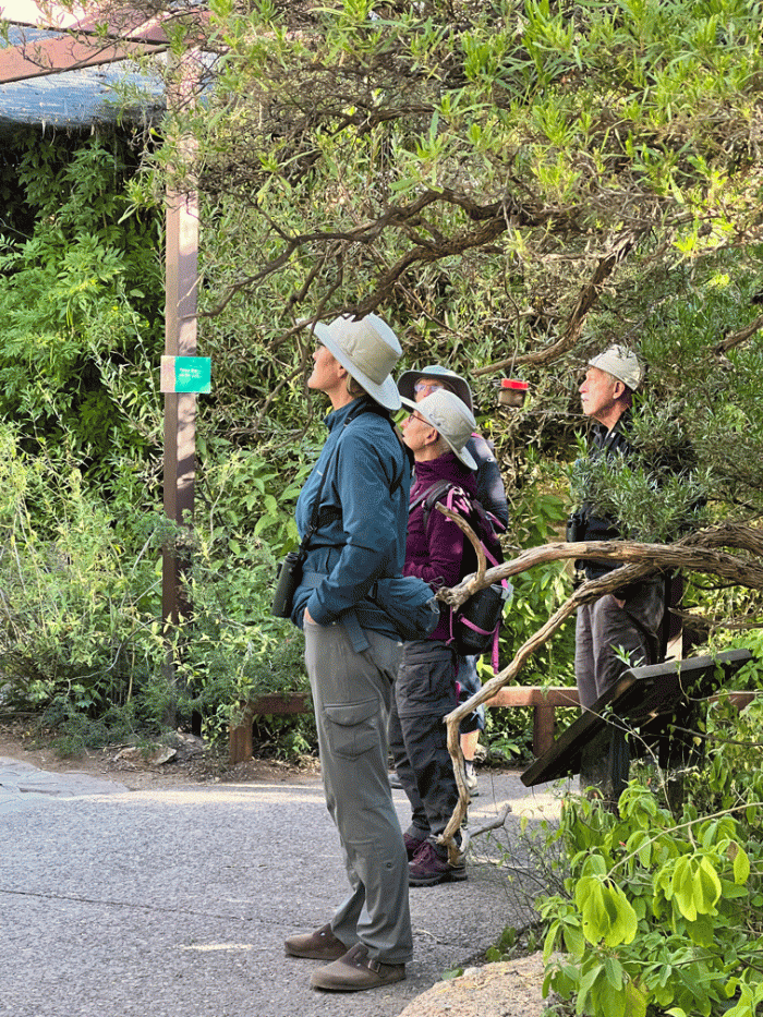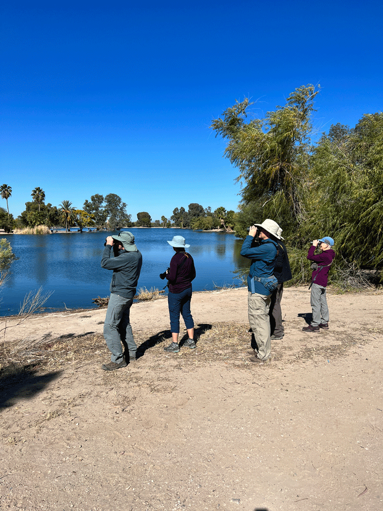 One day, we did some urban birding at Reid Park. Here the group is surrounded by ducks; both wild and domestic. Jo Ellen and Gretchen are looking up at some Black-crowned Night-herons that are perched in the branches above.