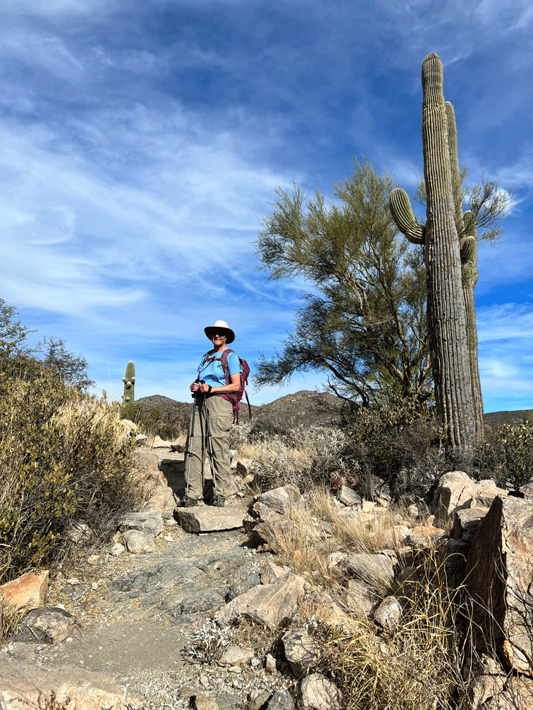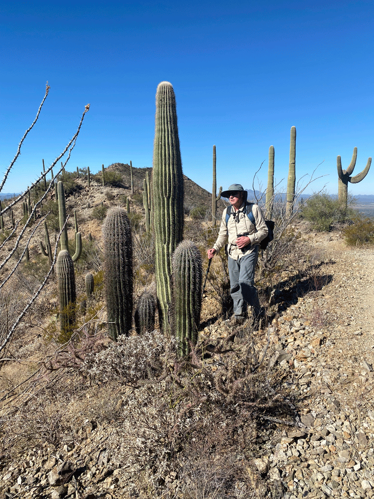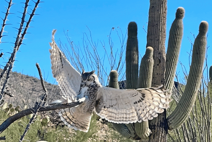 The morning after we arrived at our place just outside of Tucson, Arizona, we were welcomed by a family of Harris’s Hawks. One of the hawks perched about ten metres from our patio, while the others perched on nearby saguaros. Here’s an iPhone photo of the closest hawk, since Doug had not yet unpacked his big camera.