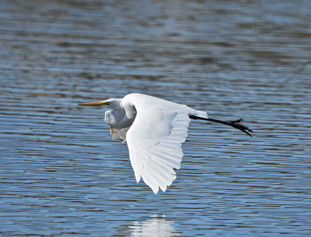 And this Great Egret took to flight nearby as well. Notice its black feet; Snowy Egret’s feet are yellow.