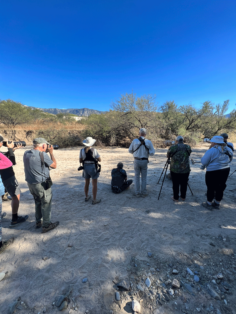 A few days after that interesting sighting, we read in the Rare Bird Alert that a Fan-tailed Warbler had been seen in a wash near Catalina State Park. This was a very rare bird for the area. Using our eBird app, we could determine the location where it had been seen. The number of people waiting around for it to show up was also an indication that we were in the right place. We looked around the area for an hour or two without any success, so we headed off to another location to look for different birds. We figured the bird had flown away in the night.