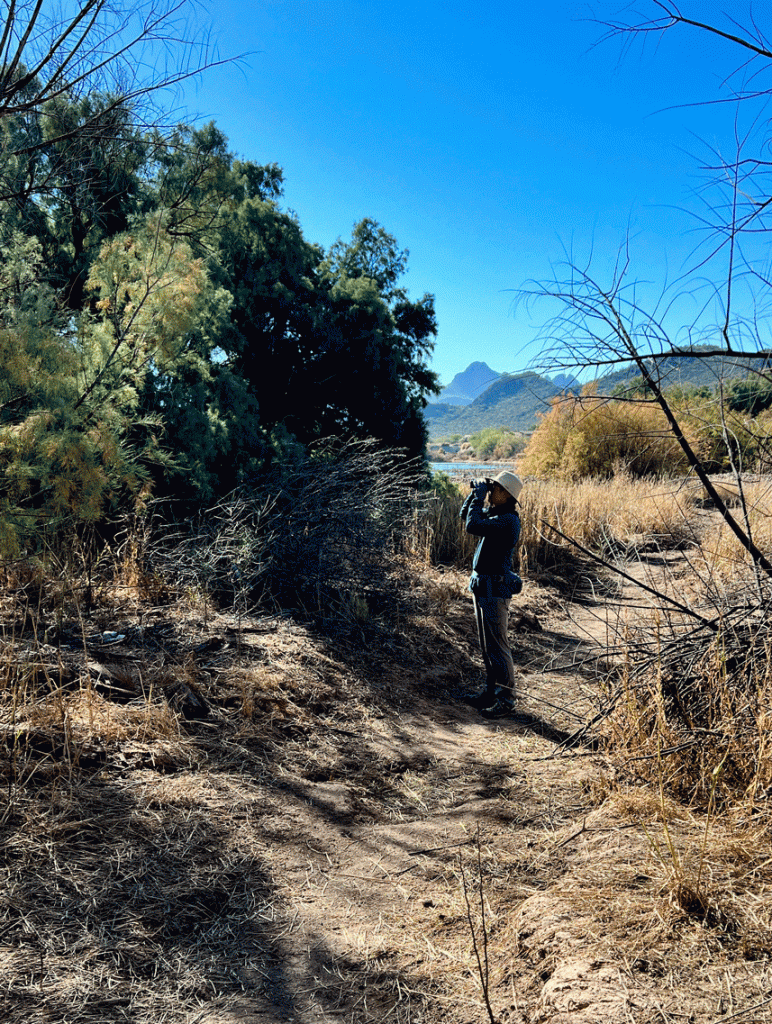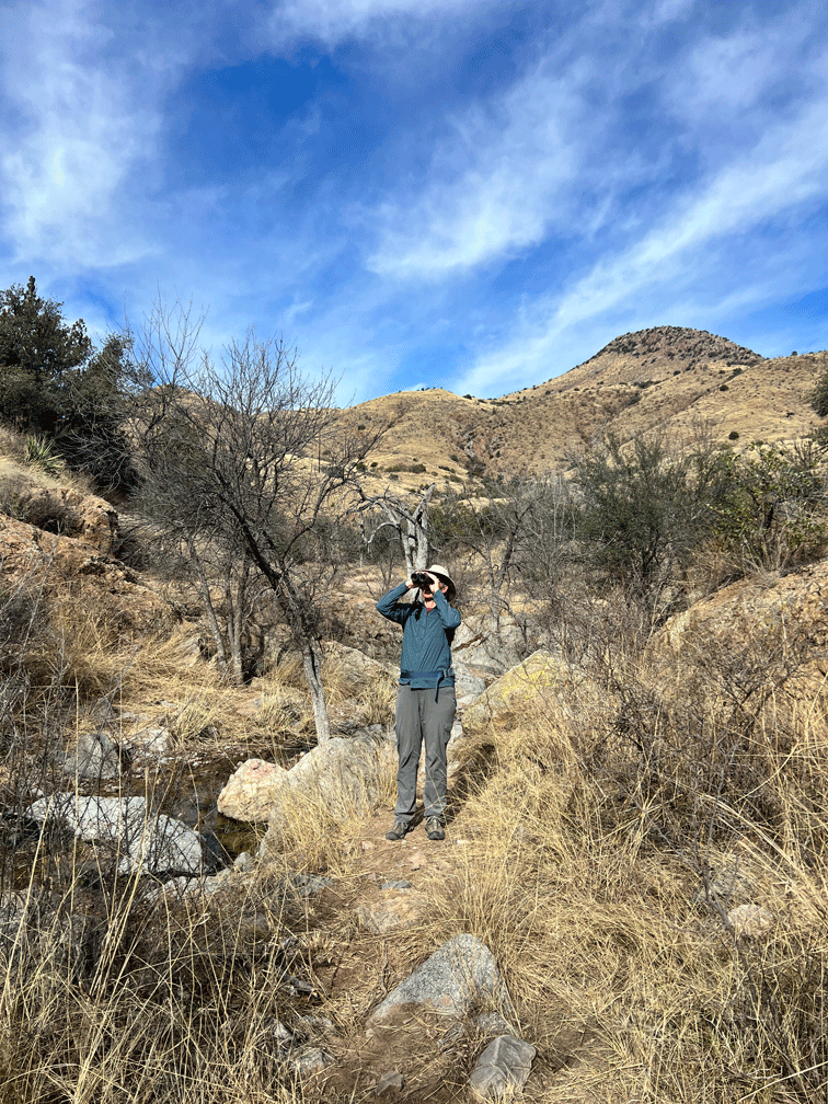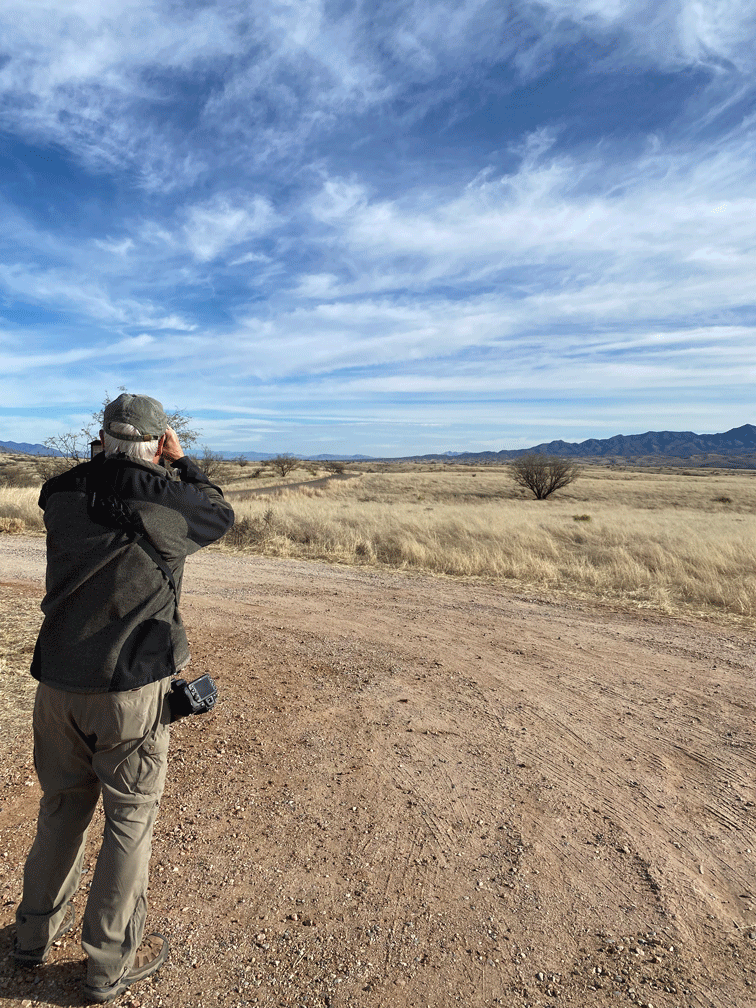 We made another trip to Las Cienegas Natural Conservation Area. There are six types of ecosystems in the 42 000 acre block of now-protected public land. In the photo below, Doug is looking over semi-desert grassland. From this spot, we saw a Chihuahuan Meadowlark and four species of Raptors: Red-tailed hawks, Northern Harriers, American Kestrels and White-tailed Kites.