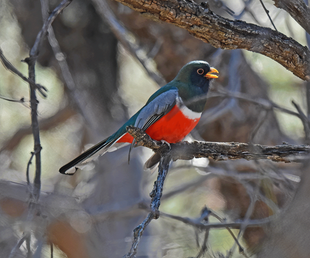 Most people went back to the parking area, but Wendy scrambled down the bank on an animal path hoping to get a better view. Doug followed and we were rewarded with amazing views of a male Elegant Trogon. His red chest is very striking,