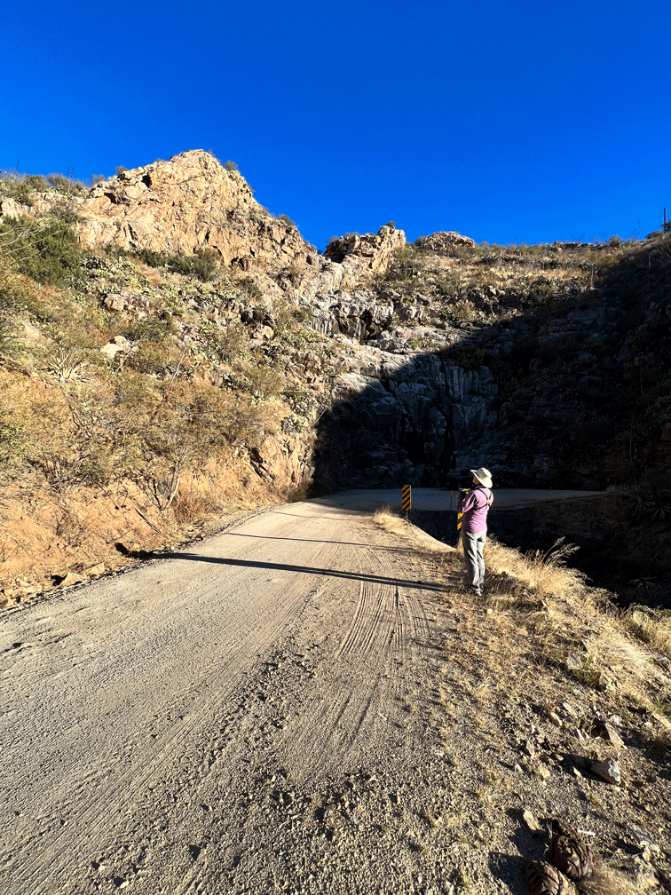 Another day we familiarized ourselves with a small section of Box Canyon. We watched this almost dry waterfall for over an hour. Some of the birds were below us, some were high on the ridge and some mostly stayed in the middle. It was interesting to see the wildlife “wake up” as the sun hit the rocks. We also saw a family of coatis scrambling among the rocks.