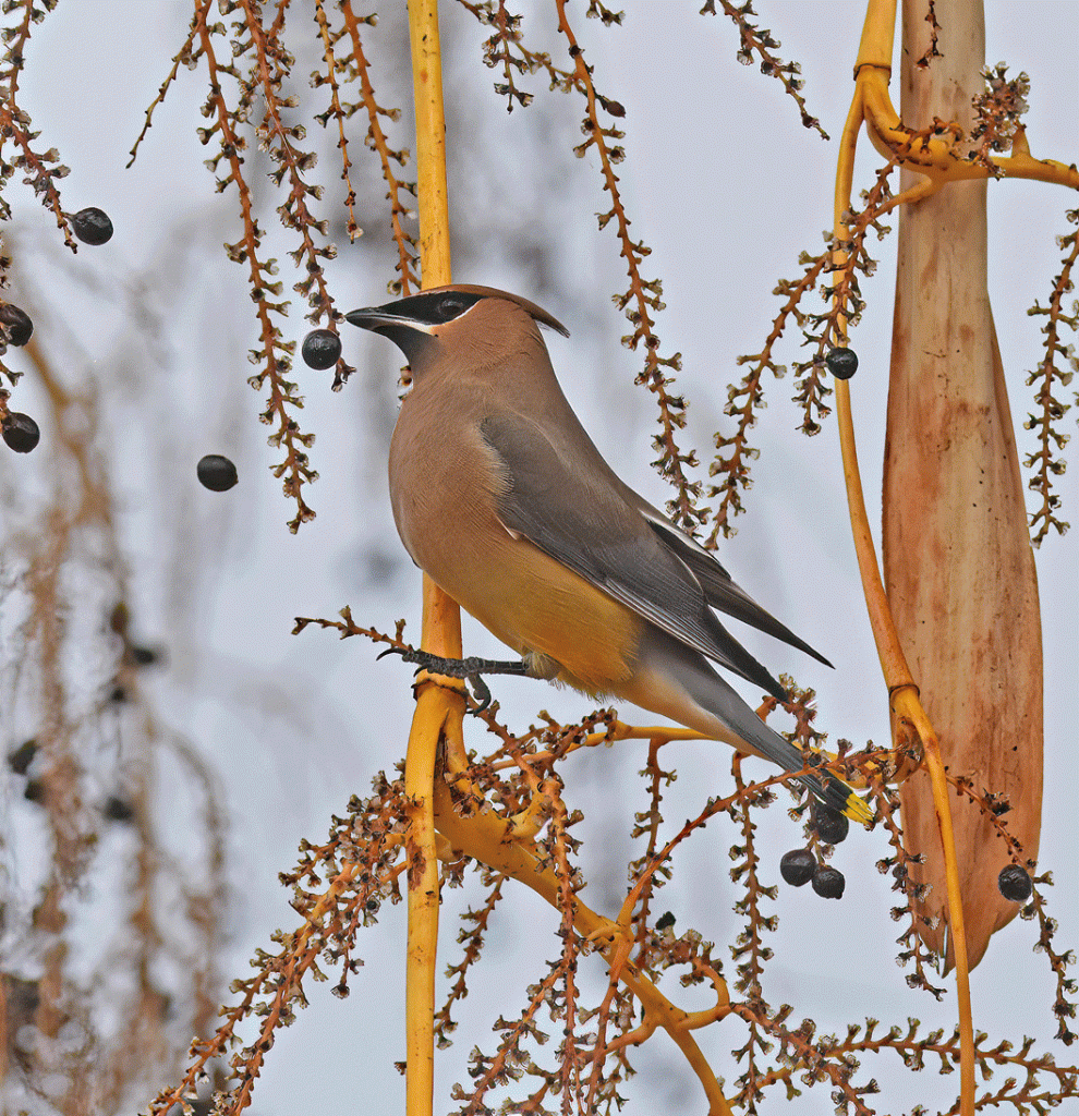 On the way home, we stopped at Reid Park, which always has interesting birds. We see Cedar Waxwings often in the park, since they enjoy the fruits of the various introduced trees. This one was in a Acai palm tree.