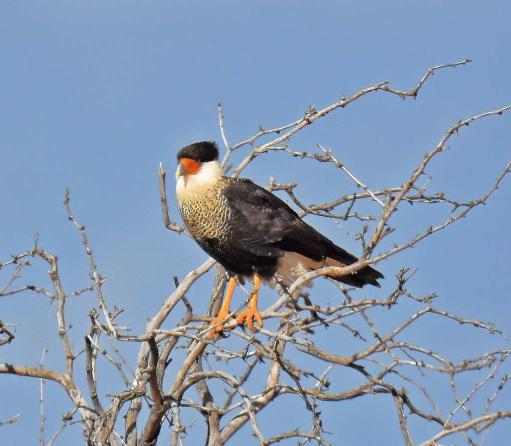 At the beginning of January, we went out to an area of desert scrub, hoping to see a Bendire’s Thrasher. We eventually saw the thrasher, but on the way, we got a good view of a Crested Caracara, perched in the dead branches of a tree. We’ve had many sightings of a Crested Caracara in the wild, but we have not often seen them perched. The caracara was the “bonus” bird of the trip.