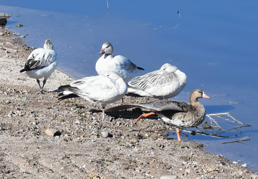 These four Snow Geese have been hanging out at the Green Valley Water Reclamation Facility. The goose in front is a Greater White-fronted Goose, but it seems happy enough to join them. Greater White-fronted Geese breed in the Arctic Tundra.