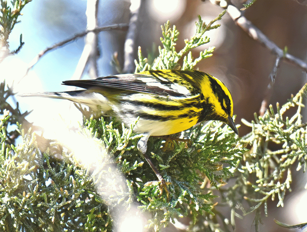 The next day, we went to Madera Canyon, mainly to see sapsuckers (Williamson’s, Yellow-bellied and Red-naped). We spent a couple of hours looking for and at sapsuckers, and saw all three species. This good view of a male Townsend’s Warbler was the “bonus” bird.