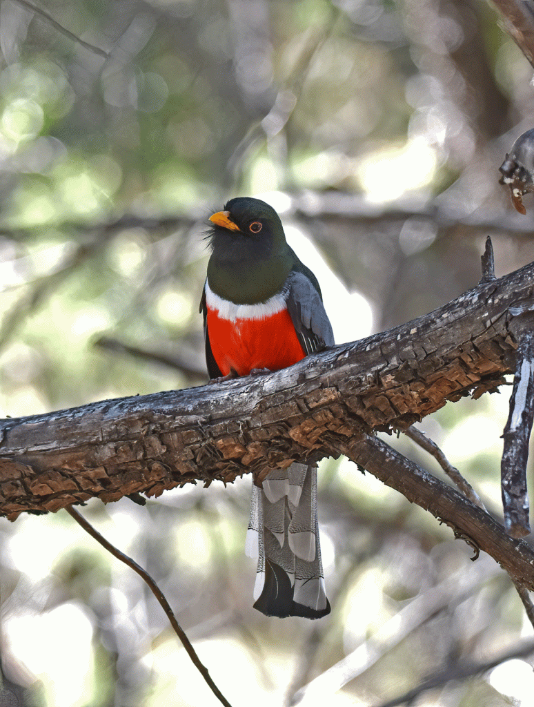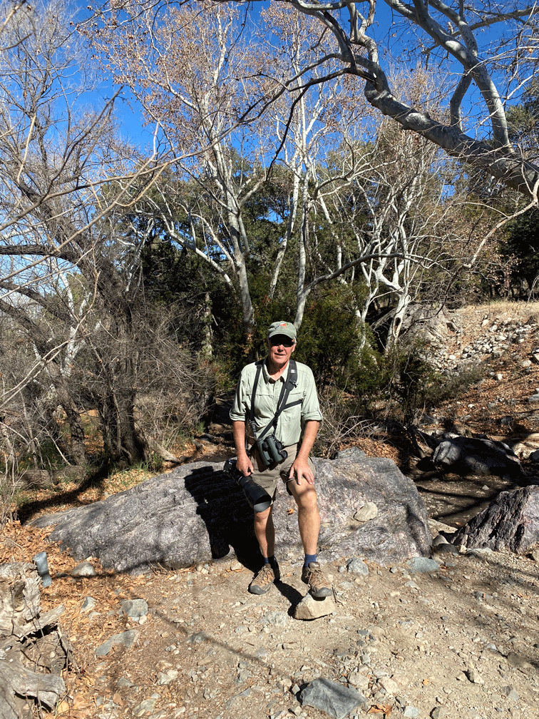 One of the most exciting sightings in February was of the Elegant Trogon. This time we walked up and down Madera Canyon in search of the bird. Shortly after noon, we were heading back down canyon again and uphill hikers, noticing our binoculars, told us they had just seen the trogon. So we picked up the pace and soon met a group of photographers that let us know we had just missed it, but it was heading downstream. Soon we caught up to it. It stayed on this perch in the sunlight for quite a long time, so we had a really good view of his iridescent back.