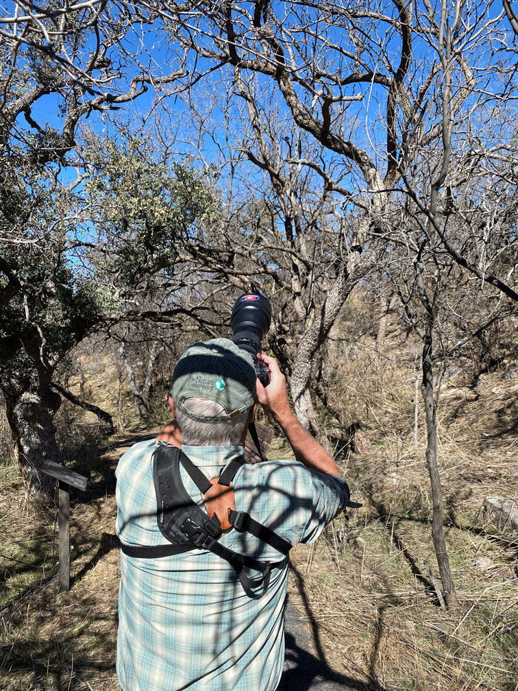 Here’s a photo of Doug taking photos of the Yellow-bellied Sapsucker. You can see that this park also has tall pines. They must have planted these trees when they were building the park.