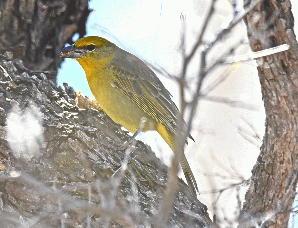 We also saw a female Hepatic Tanager at Madera Canyon that day. They are year-round in the montane pine-oak forest of Madera Canyon. We watched her eat a large grasshopper. She’s just finishing up the end of it in the photo below.