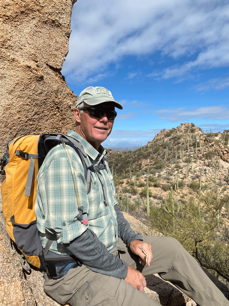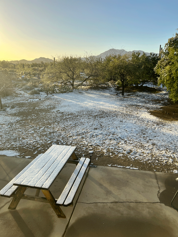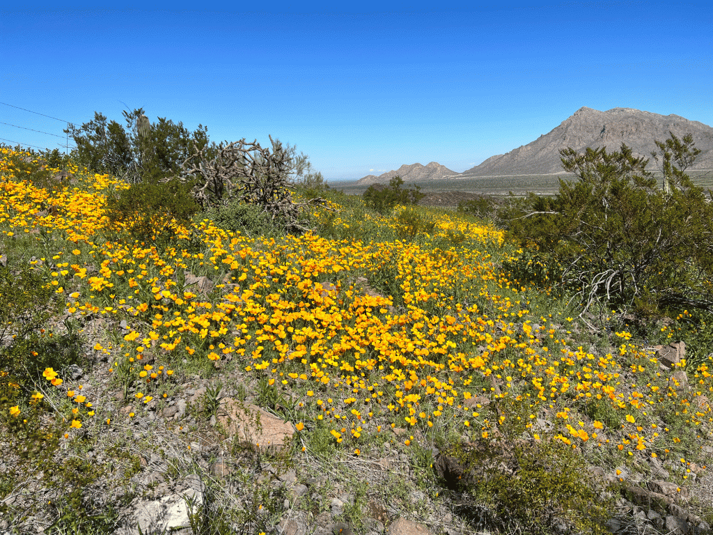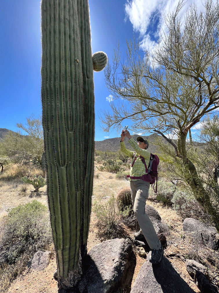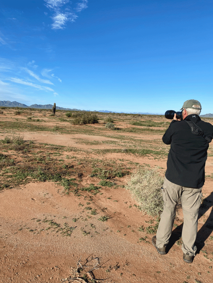 We ended the month with a successful “thrasher chase,” with a sighting of a LeConte’s Thrasher. We had tried to find this “life bird” three times before. This time, we left our place around 6:20 am and got to the spot just before 8 am. We walked out hopefully into the desert. Soon Wendy heard the thrasher singing so we followed the sound. It sang perched on a bush for over fifteen minutes as we gradually moved closer. This view of Doug taking a photo gives you an idea of the habitat of extremely arid and sparsely vegetated plains with saltbrush and creosote bush and lots of bare ground.