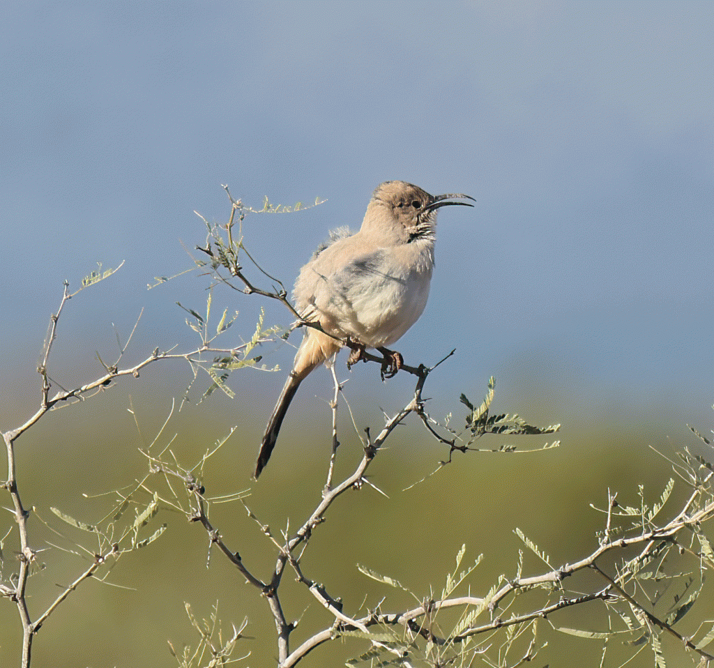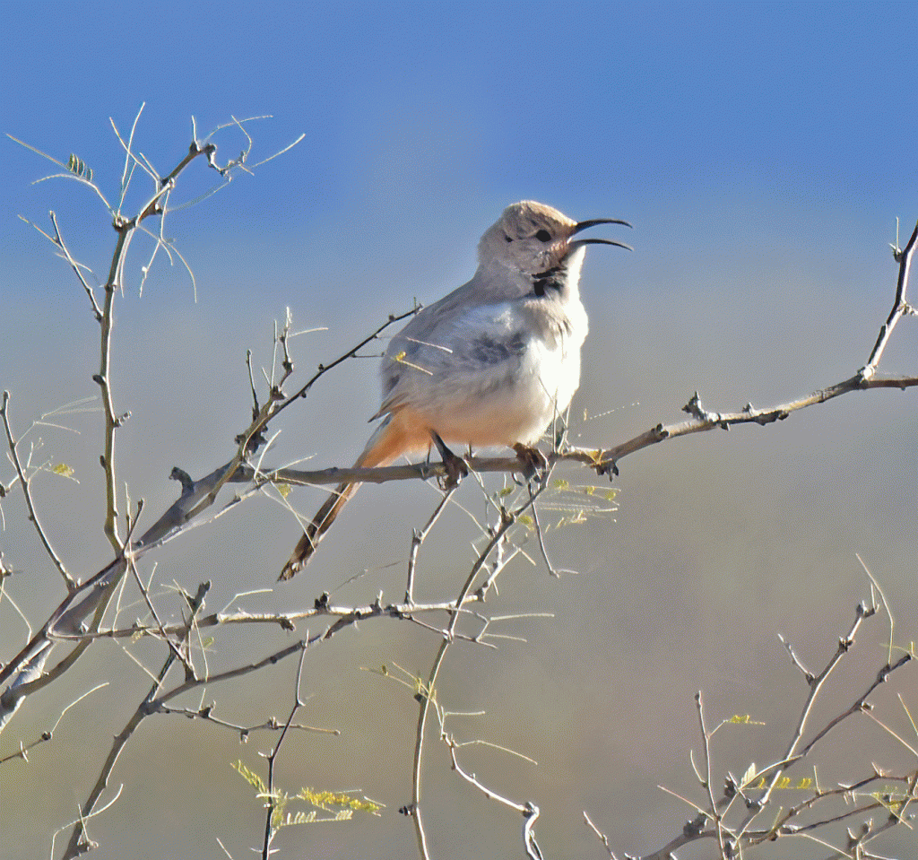 The photos that Doug took from that spot were fine for documentation purposes, but luckily for us, the thrasher ran along the ground to different bushes that happened to be closer to us. These three photos are the best out of the several that Doug took. It’s always cool to hear a bird singing and see its beak opening as it does.