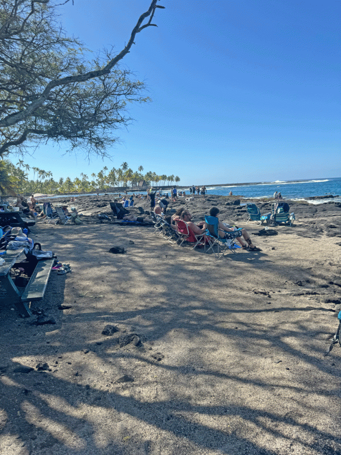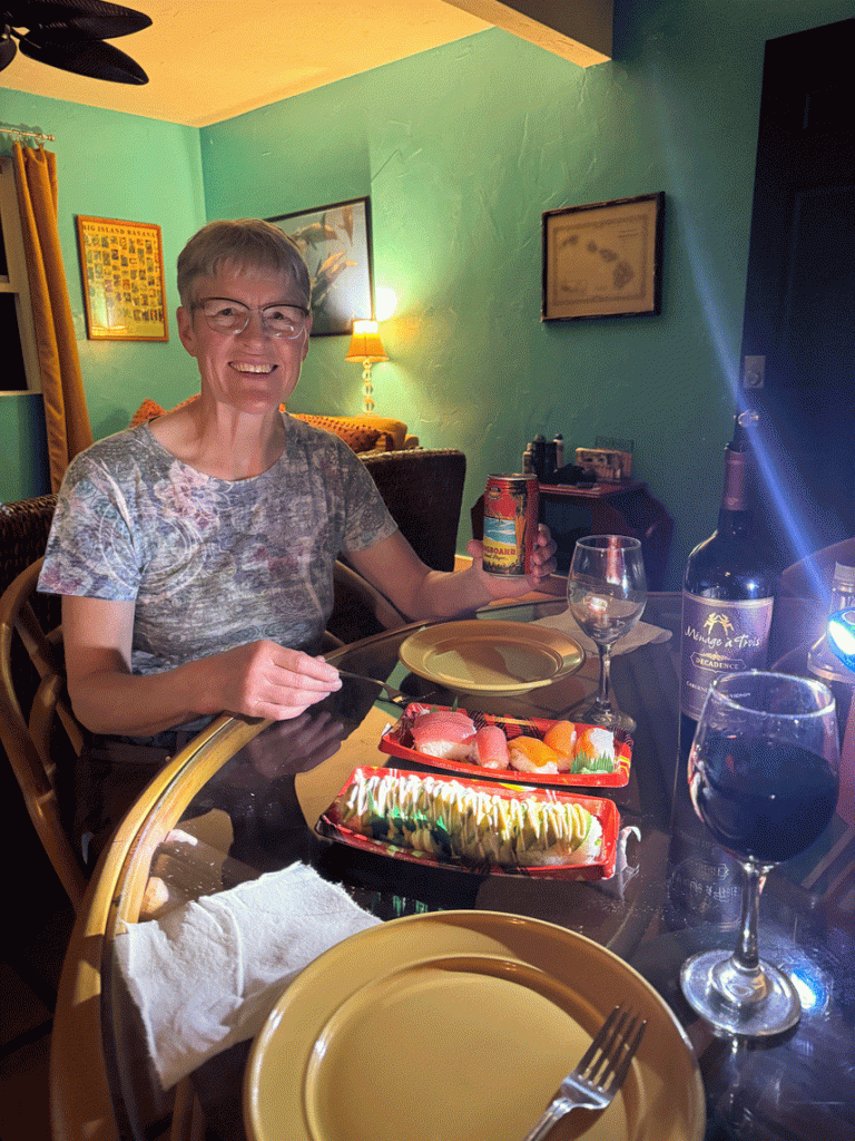 From Waimea, we drove west to the coast. We spent about two hours sitting around in the shade at Spencer Beach. We had our a dinner of sushi, sitting at a picnic table, then changed into our travelling clothes and headed to the airport.