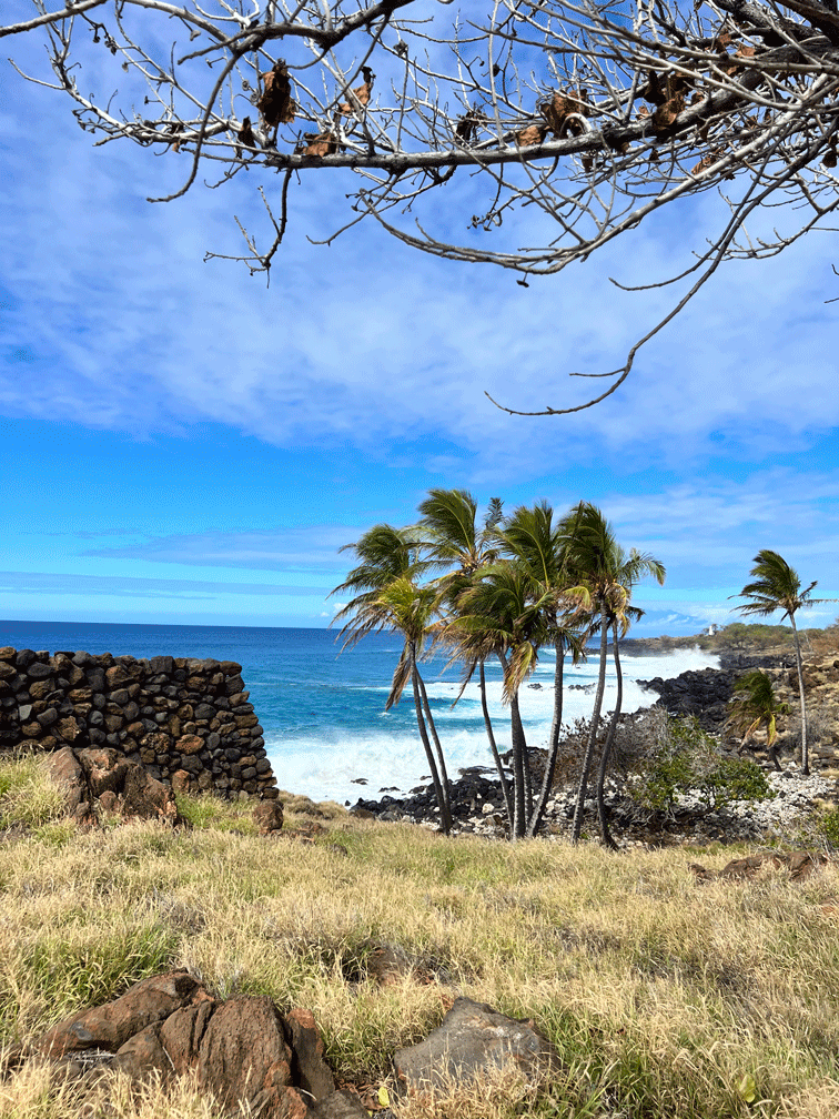 On our last day, we left our BnB in the morning and didn’t need to be at the airport until after dinner. So we went on a road tour to North Kohala. We stopped at Lapakahi State Historical Park and wandered down a trail to a view of the ocean. The state park is on the site of an old Hawaiian village.